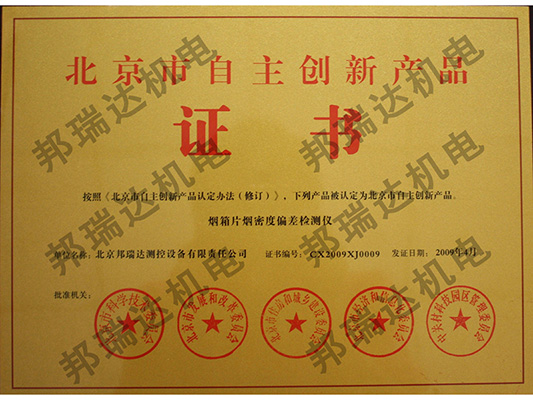 我公司研發(fā)的“煙箱片煙密度偏差檢測(cè)儀”獲得了北京市自主創(chuàng)新產(chǎn)品證書(shū)